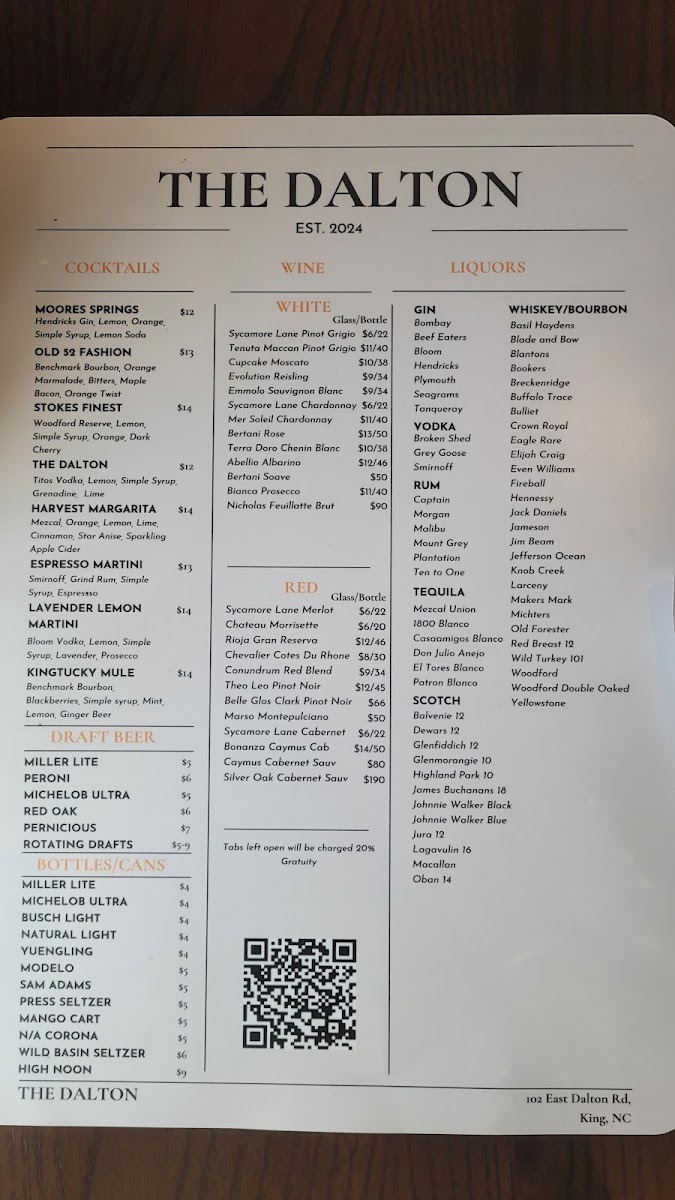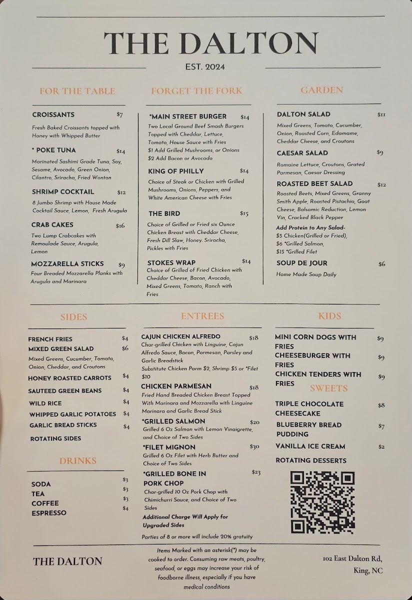 Welcome to The Dalton, a charming culinary gem nestled in King, NC. At 102 E Dalton Rd, this restaurant blends a cozy atmosphere with an impressive menu that tantalizes the senses.