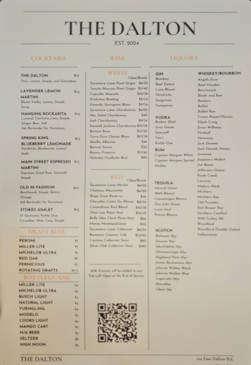 The drink menu complements the food beautifully, featuring classic sodas and refreshing mocktails. Reviewers rave about the service and the atmosphere, calling it a new landmark in King. Whether you're a local or just passing through, The Dalton promises a memorable dining experience that leaves you wanting more.